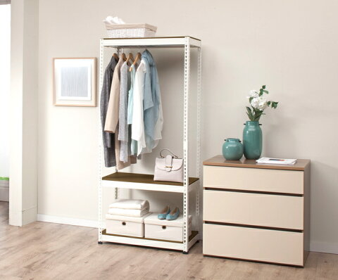 ) 【JANコード】 ホワイト:4560203303354 ブラック:4560203303361 【棚板カラー(表裏の2色)】 木目ナチュラル/木目ダークブラウン 【材質】 スチール(粉体塗装) MDFボード(PVCシート貼り) ポリプロピレン 【棚板サイズ】 幅800×奥行400×厚9mm/1枚 【商品サイズ】 約13.5kg 【耐荷重】 棚1枚当50kg(測定前) ハンガーバー1本当たり20kg(測定前) 【組立工具】 ゴムハンマー(商品に同梱) 広告文責 (有)パルス 048-551-7965 「通常土日祝日を除く1週間以内に出荷の予定ですが万が一欠品やメーカー終了の場合は別途メールにてご連絡いたします」『スチール&木調ボードラック 3段(ハンガーバー付) MK-883HWH/MK-883HBK ホワイト/ブラック』インテリア 家具 収納家具 棚 ラック オープンラック スチールシェルフ